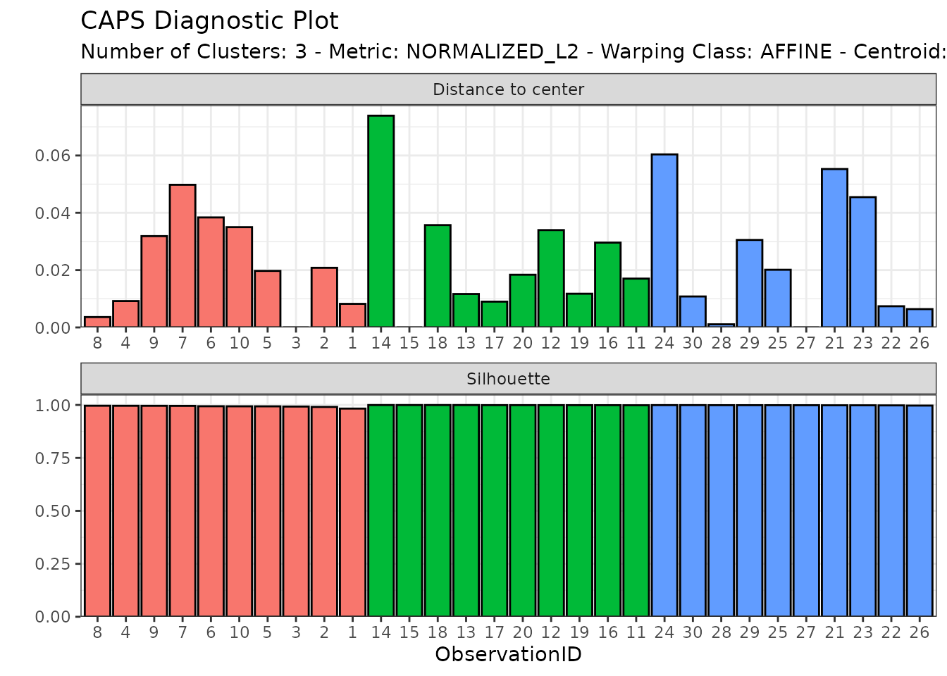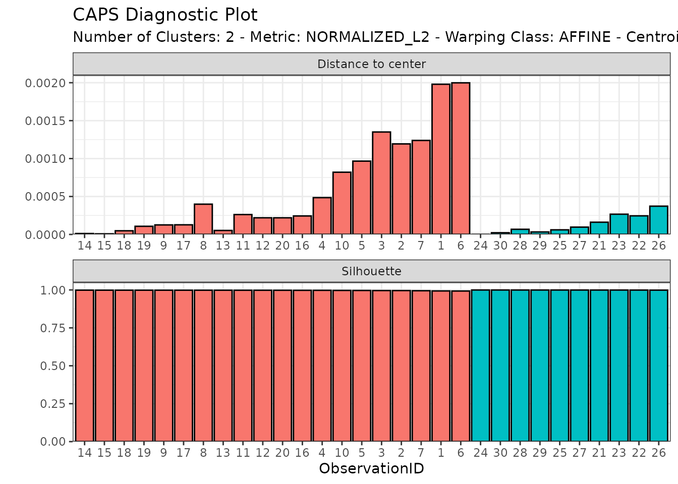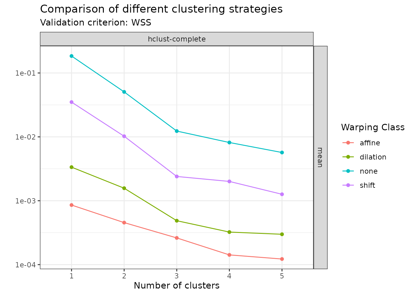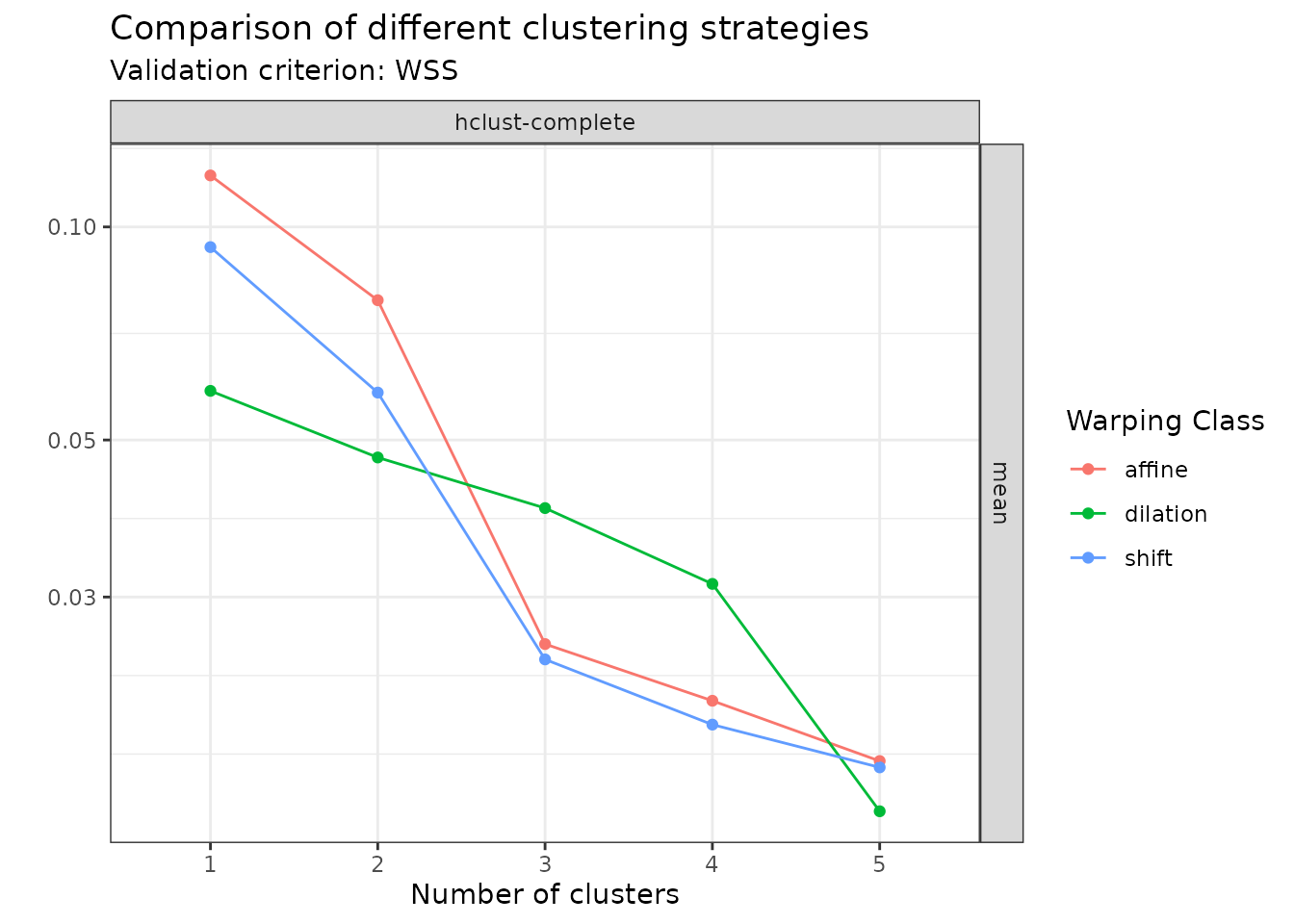 In this case, as expected by looking at the original data set, the plot suggests to search for groups. What is even more interesting is that there is in this case no improvement in terms of WSS by going from the shift warping class to the affine warping class. This was also expected by looking at the original data set but it is nice that it is also reflected in the output diagnostic.